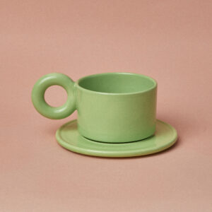 Ręcznie wykonany ceramiczny kubek. Kubki JACKIE wykonane są z kamionki. Każde naczynie markowane jest stemplem odbitym na spodzie. Seria JACKIE została zainspirowana designem z lat 50 XXwieku. w USA, w projekcie użyliśmy kształtów nawiązujących do branży astronautycznej, a kolorystyka naczyń odwołuje się do kolorowej szkoły plakatu i szału raczkującego konsumpcjonizmu. Zestaw ceramicznych kubków i spodków idealnie nadaje się na wyjątkowy prezent dla miłośnika polskiego rzemiosła i designu. Ze względu na wypalanie w wysokiej temperaturze nasze naczynia ceramiczne charakteryzują się wysoką wytrzymałością.